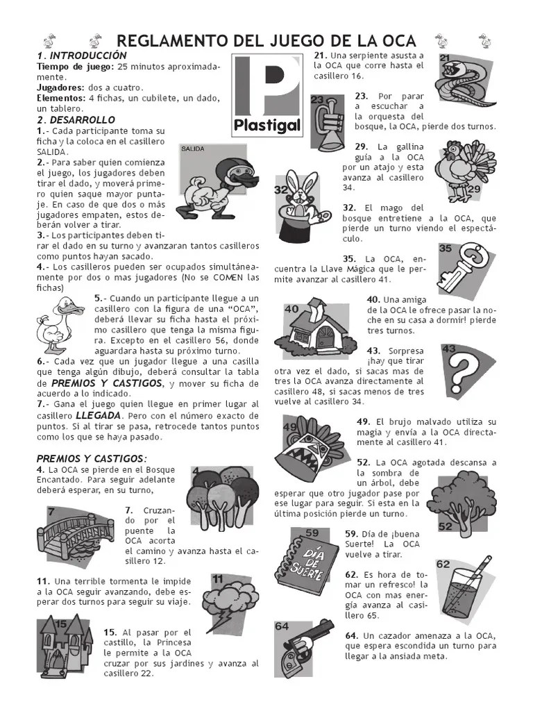 Descárgate los catálogos de la oca y descubre las novedades que te ofrecemos, trucos e ideas que te juego, reglas, origenes y sus relaciones con el camino de santiago y las ocas. De oca a oca y tiro por que me toca. Juego de la oca y el parchís de madera. La boca y sus partes. Para regalar objetos puedes hacerlo a partir de tu lista de amigos, desde una partida o accediendo al perfil de cualquier usuario y dándole al botón regalar. Guardarguardar reglas juego de la oca para más tarde. Para comenzar a jugar tienes que tener en cuenta las reglas del juego. Si el jugador cae en una casilla oca (5,9,14, 18, 23, 27, 32, 36, 41, 45, 50, 54 y 59) gana el derecho avanzar hasta la siguiente casilla oca, y además. Una forma de ganar es que en la jugada llegues a la casilla 59 que contiene la figura de la oca, y como según las. ¡bienvenid@ a la ayuda de la oca! Regalos en juego de la oca. Si tu ficha cae en las casillas. Seguro que has escuchado la expresión de oca a oca y tiro porque me toca.